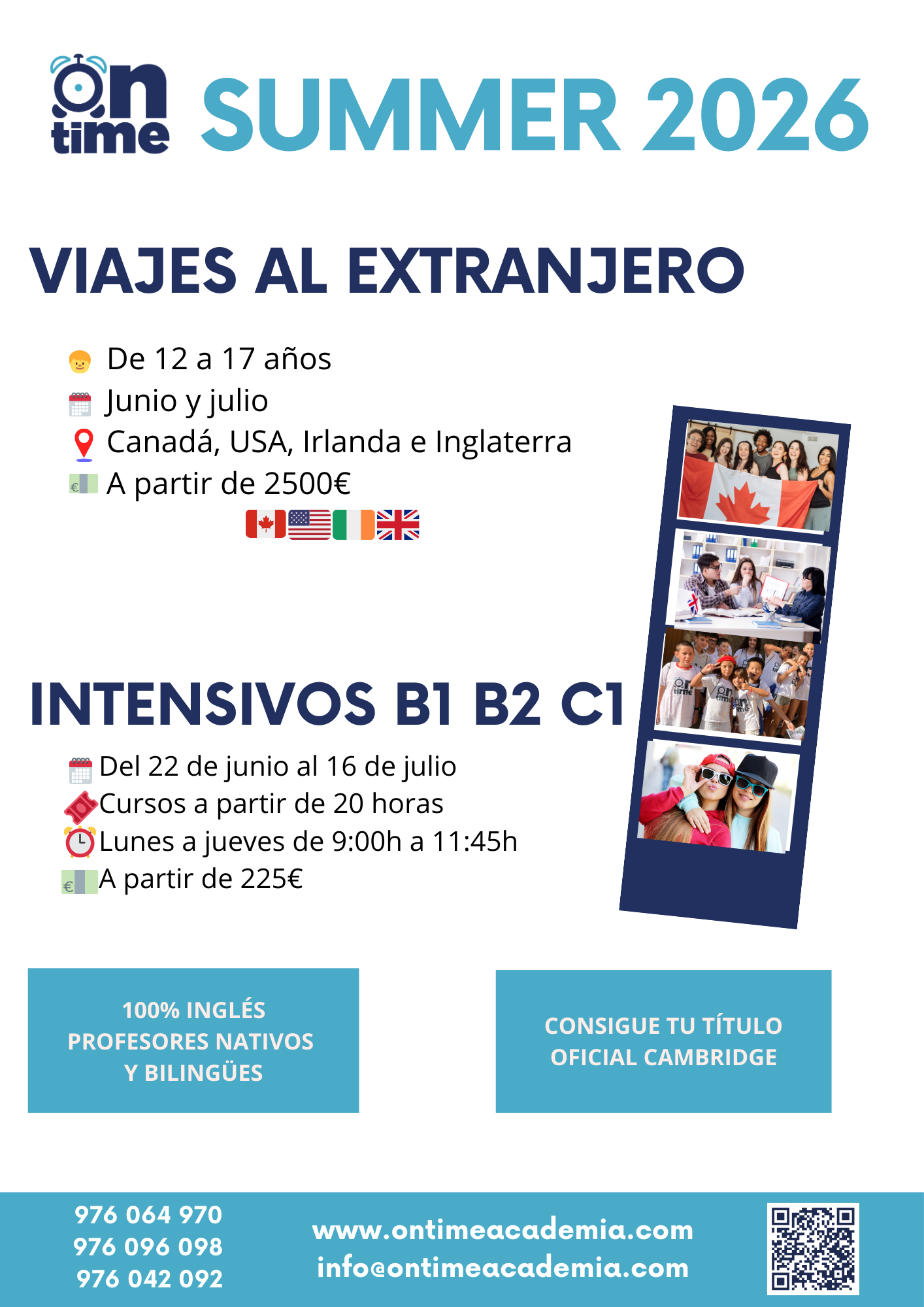 Programas para jóvenes entre 12 y 17 años, con opciones de alojamiento en casas de familia o residencias. ¡Consúltanos para otros destinos!